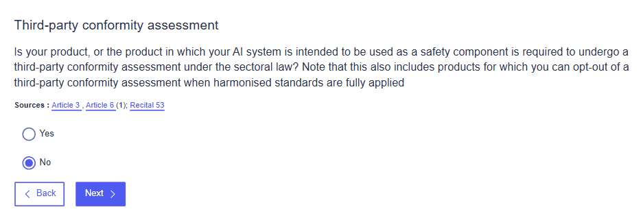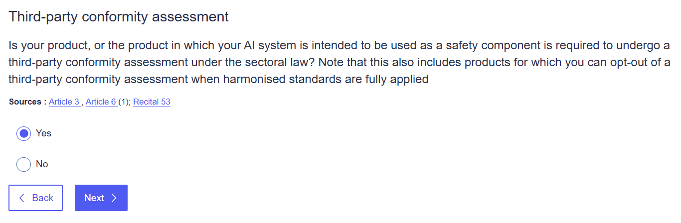 Lors de la simulation du EU AI Act Compliance Checker, contrairement à l’exemple du dispositif médical de classe I, j’indique cette fois-ci que le logiciel est évalué par un organisme tiers (l’organisme notifié) car le dispositif est de classe IIa.